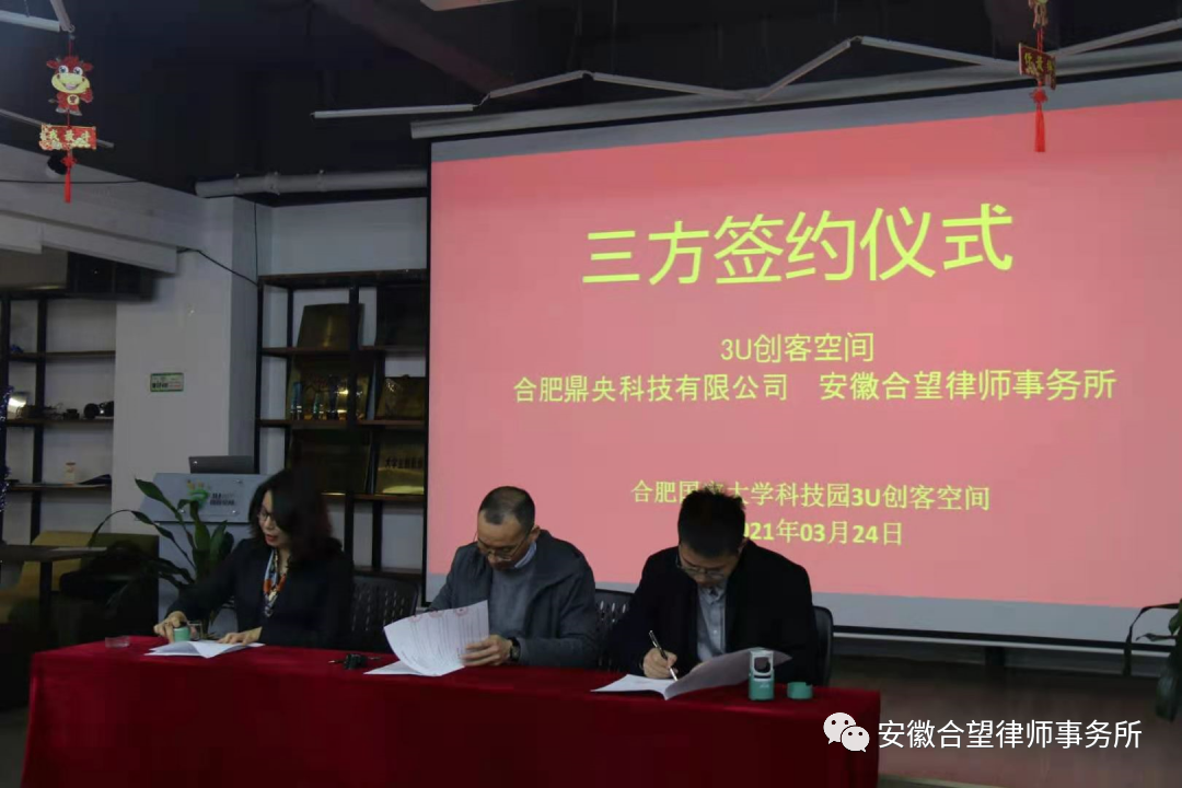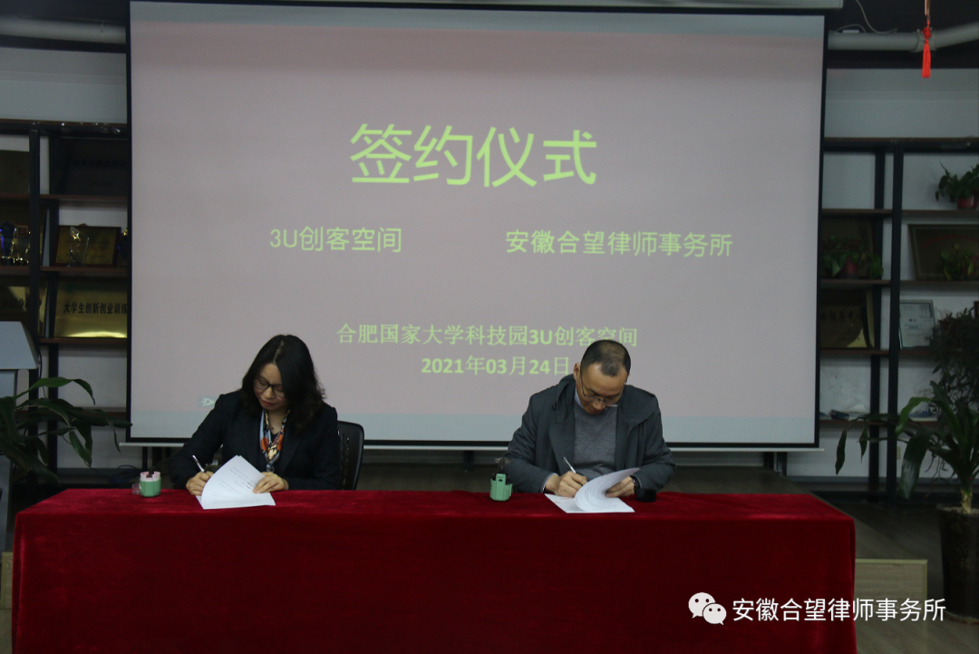同日,安徽合望律师事务所还与合肥国家大学科技园3U创客空间达成战略合作协议,由安徽合望律师事务所为园区内的企业提供法律服务。