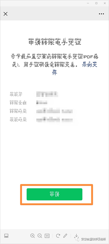 第八步:进入“申请转账电子凭证”页面,点击“申请” 。