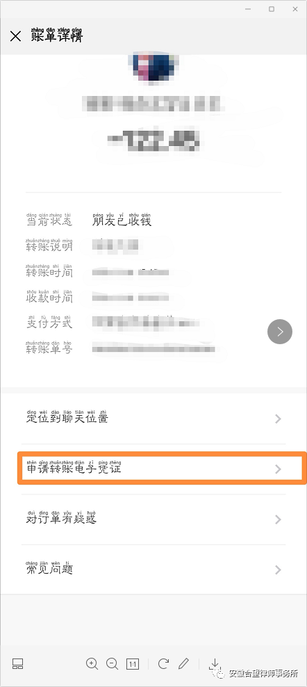 第七步:进入“账单详情”后,点击“申请转账电子凭证” 。