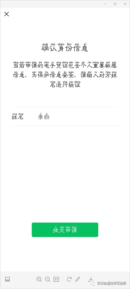第九步:进入“确认身份信息”界面,填写对方的姓名,之后点击“提交申请”。